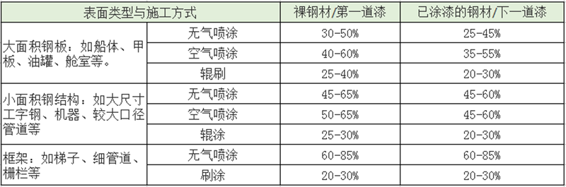 ● 漆膜厚度損耗,由于涂料分布造成的損耗,輥刷通常在5-15%,噴涂通常在15-40%。